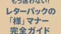 マナー もう迷わない!レターパックの「様」は消すべき?マナーと正しい消し方を完全解説 レターパックに印刷されている『ご依頼主様』の『様』は消すべき?ビジネスマナーとして正しい扱い方や、きれいに消す方法・やってはいけない消し方を詳しく紹介。返信用レターパックや宛名の敬称マナーまで、これ1本で迷わない完全ガイドです。 マナー